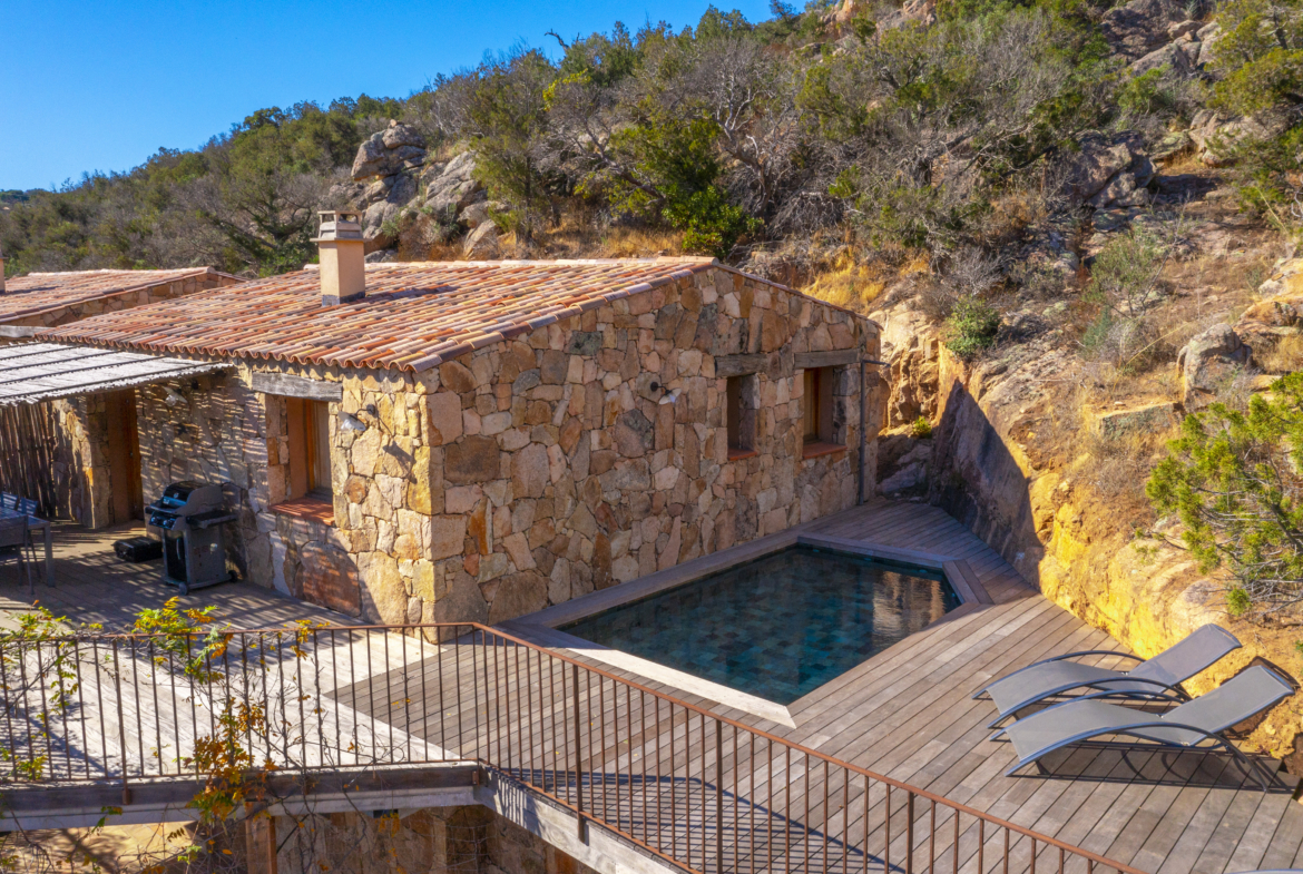 Magnifique villa en pierres de 90m² surplombant la montagne, avec vue sur la mer et piscine privée.