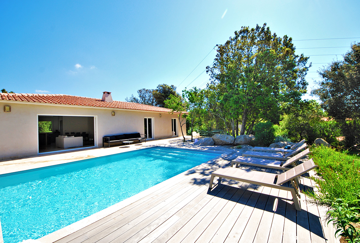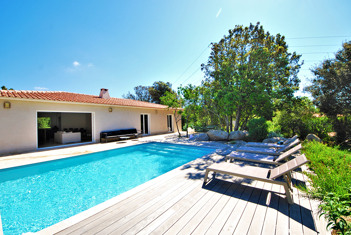 A seulement 5min du centre-ville de Porto-Vecchio, elle dispose d’une grande terrasse avec piscine chauffée et est composée de trois chambres avec lit double, une salle de douche et une de bain.